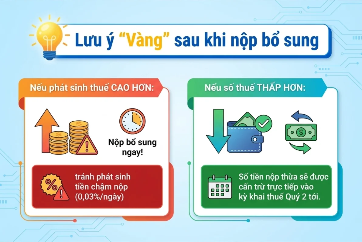 - Nếu phát sinh thuế CAO HƠN: Anh chị cần nộp bổ sung ngay phần tiền thuế chênh lệch để tránh phát sinh tiền chậm nộp (0,03%/ngày).